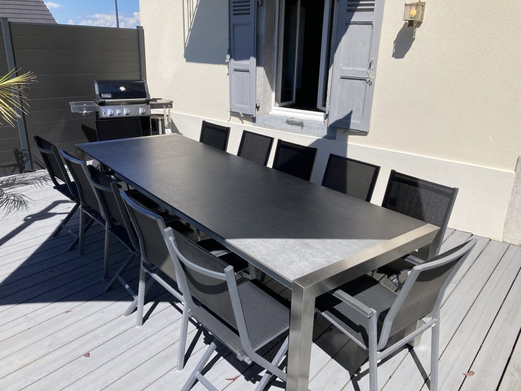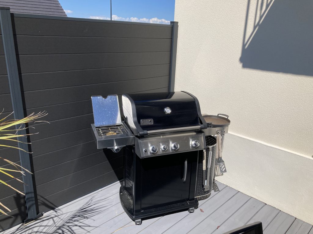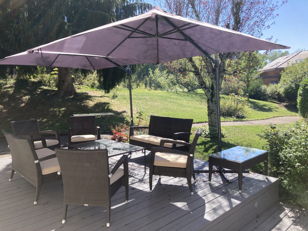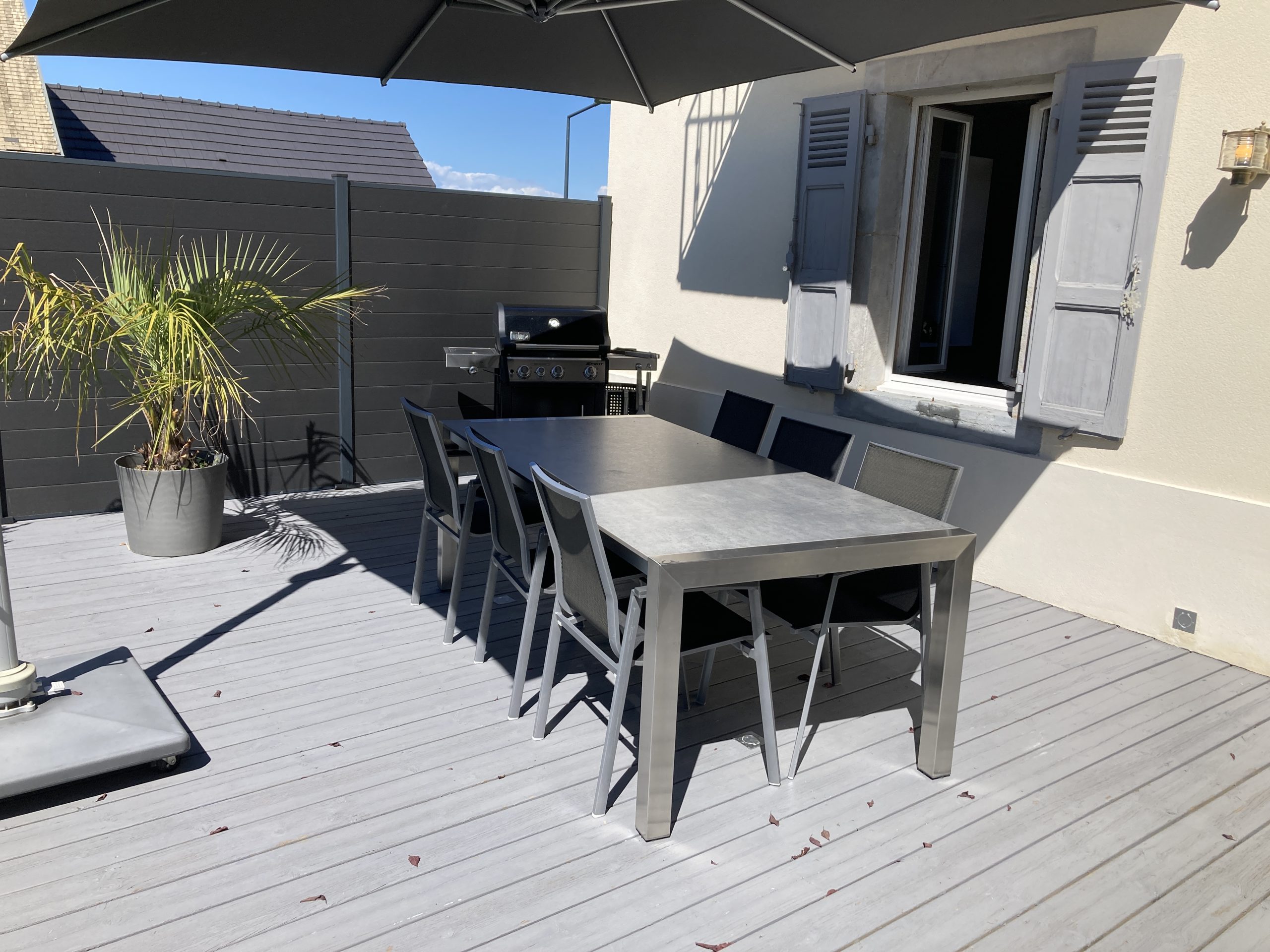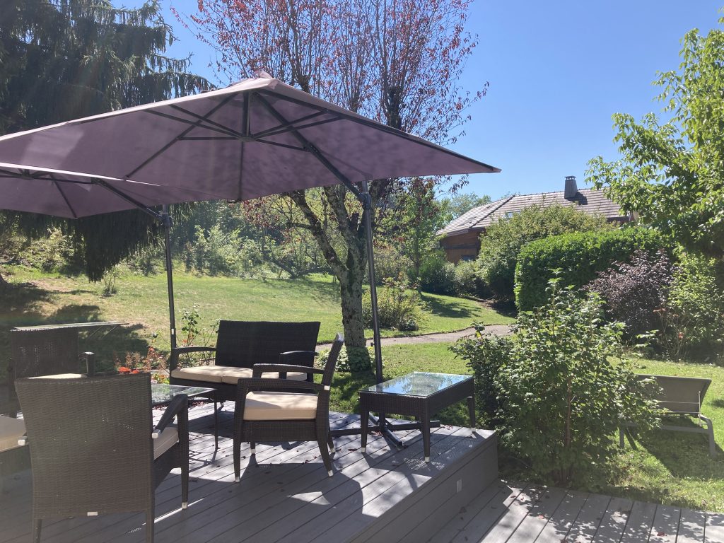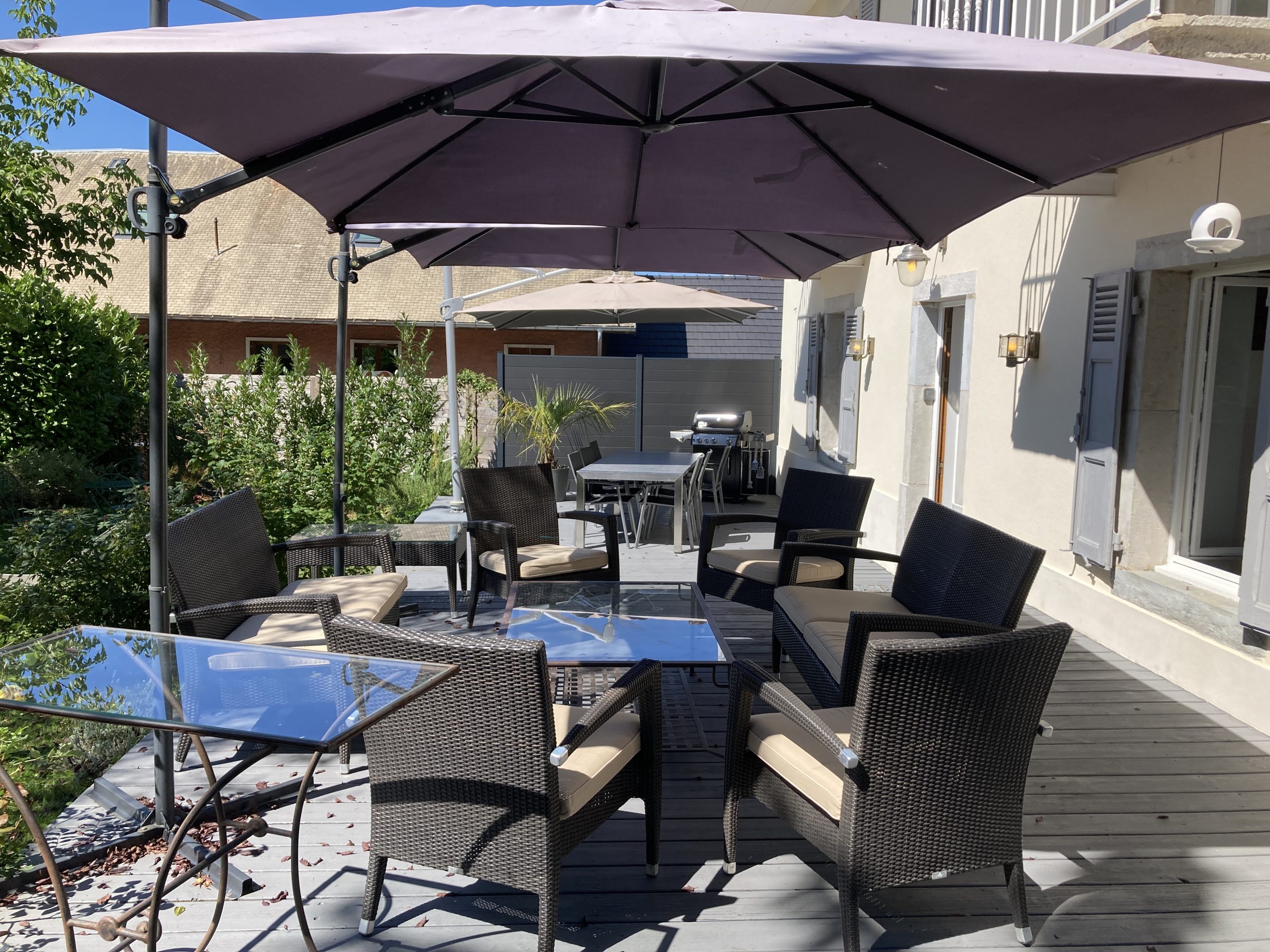 Vous profiterez d’un grand jardin arboré et d’une vaste terrasse en bois avec un salon de jardin, des parasols et un espace repas avec barbecue extérieur.
