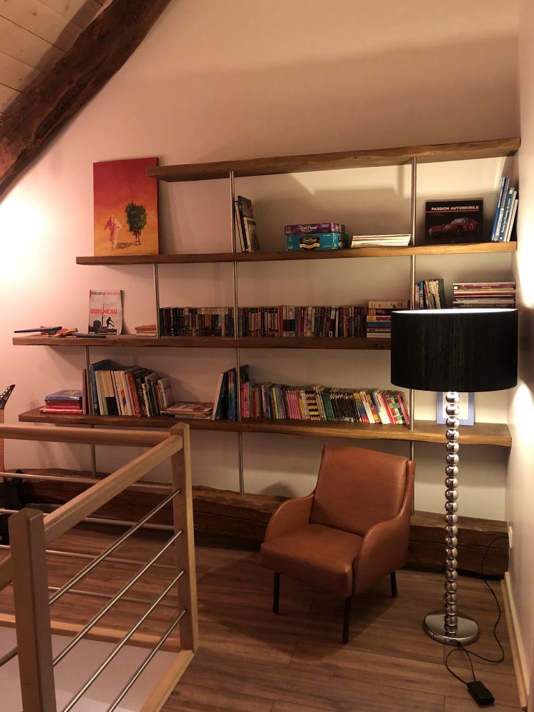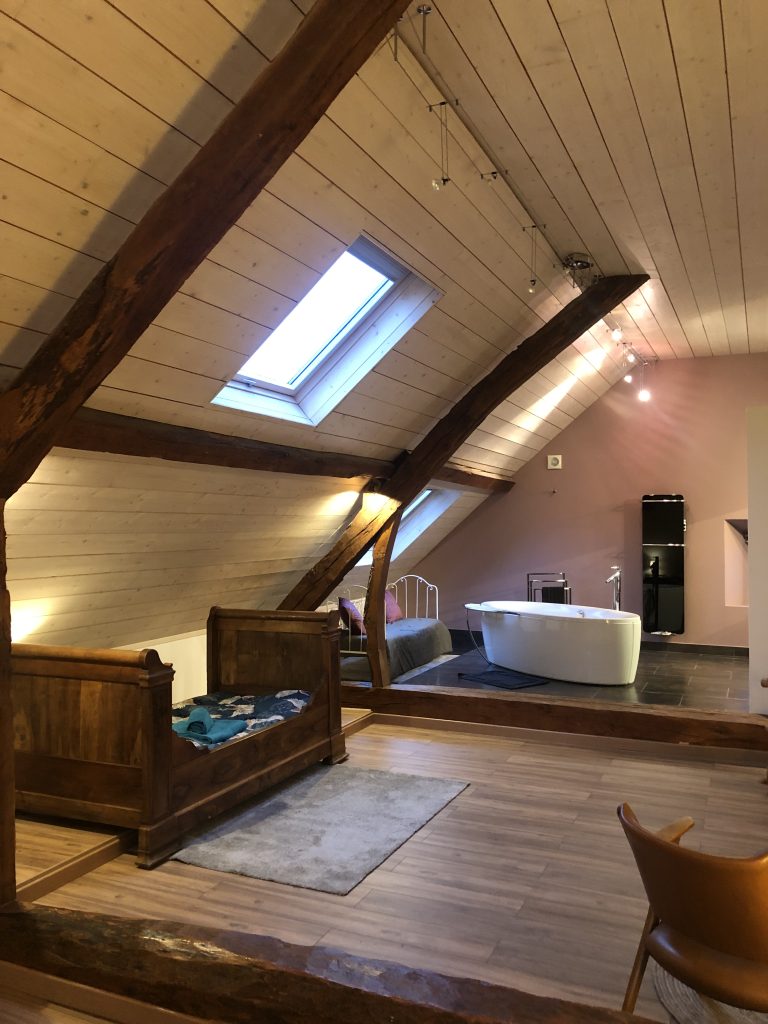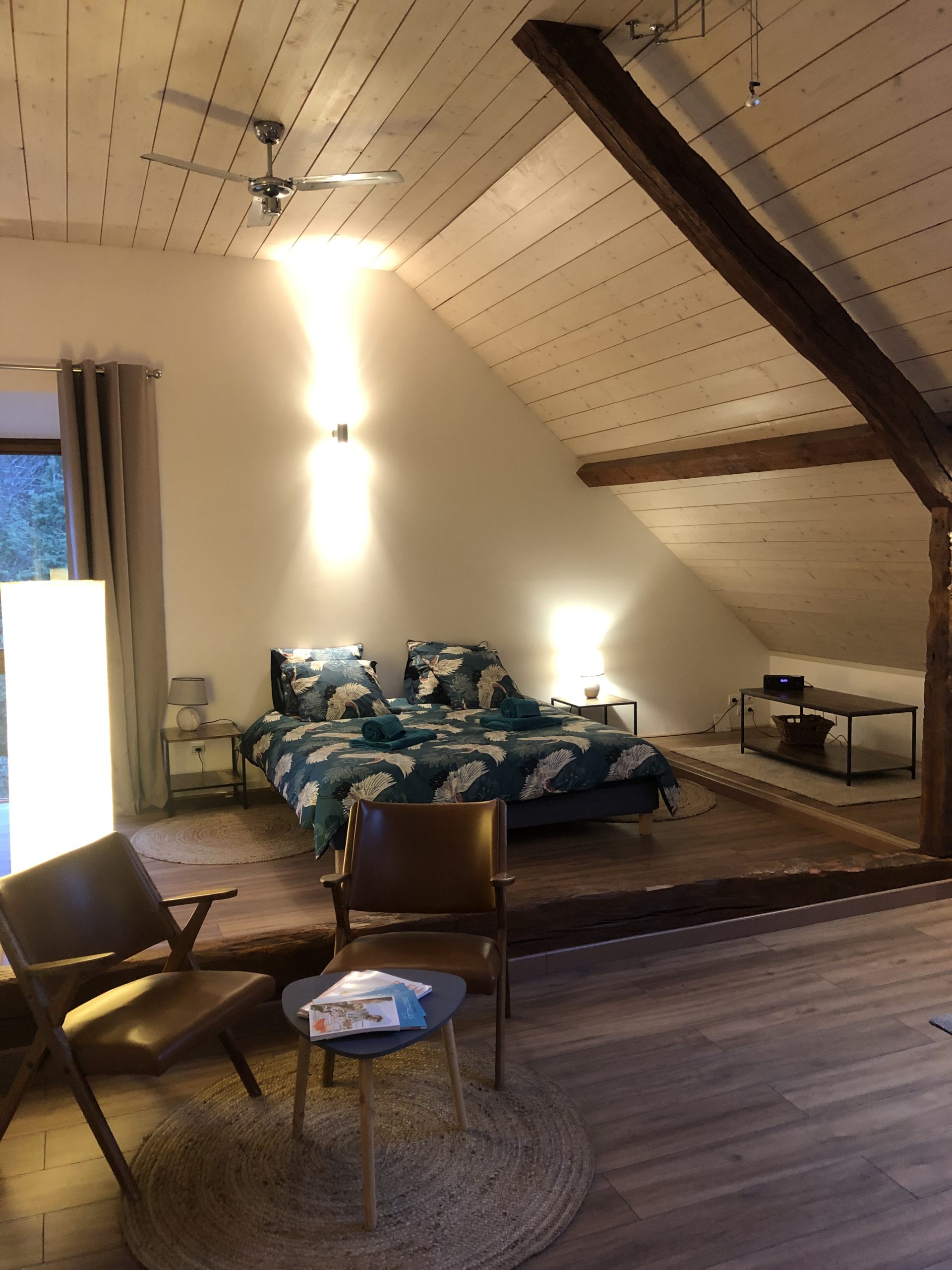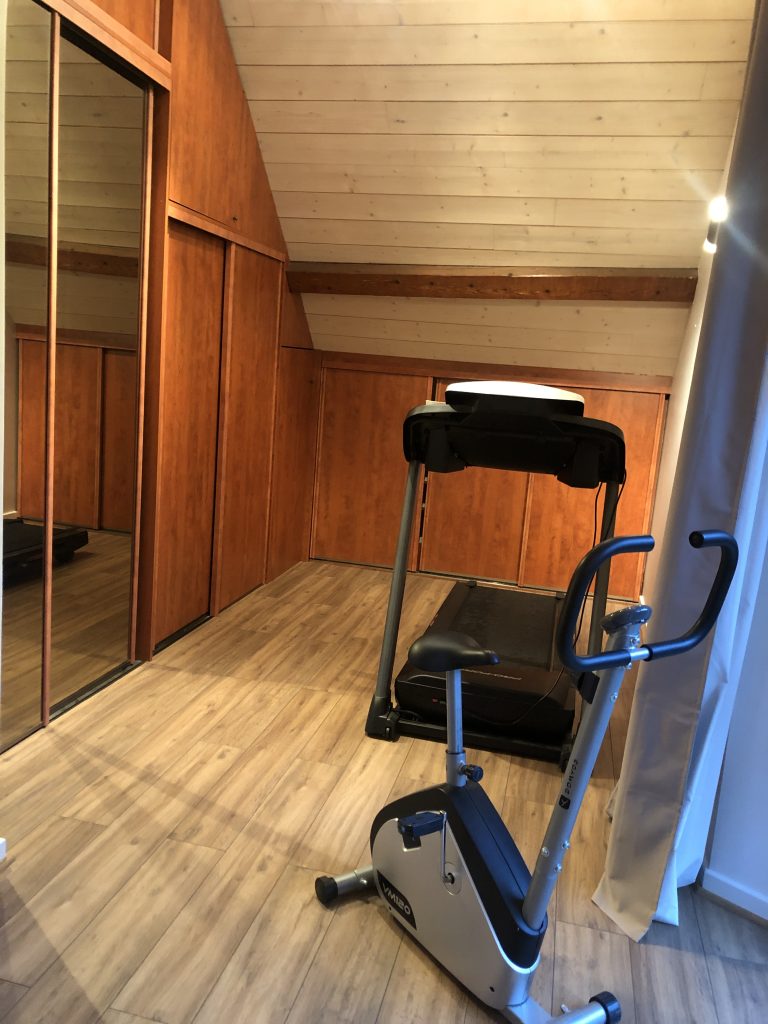 - une vaste suite avec un lit king size et un lit de 100×180, équipée d’une salle de bain avec baignoire et douche, dressing, et d’un espace détente ainsi que d’un espace sport (tapis de marche, vélo).