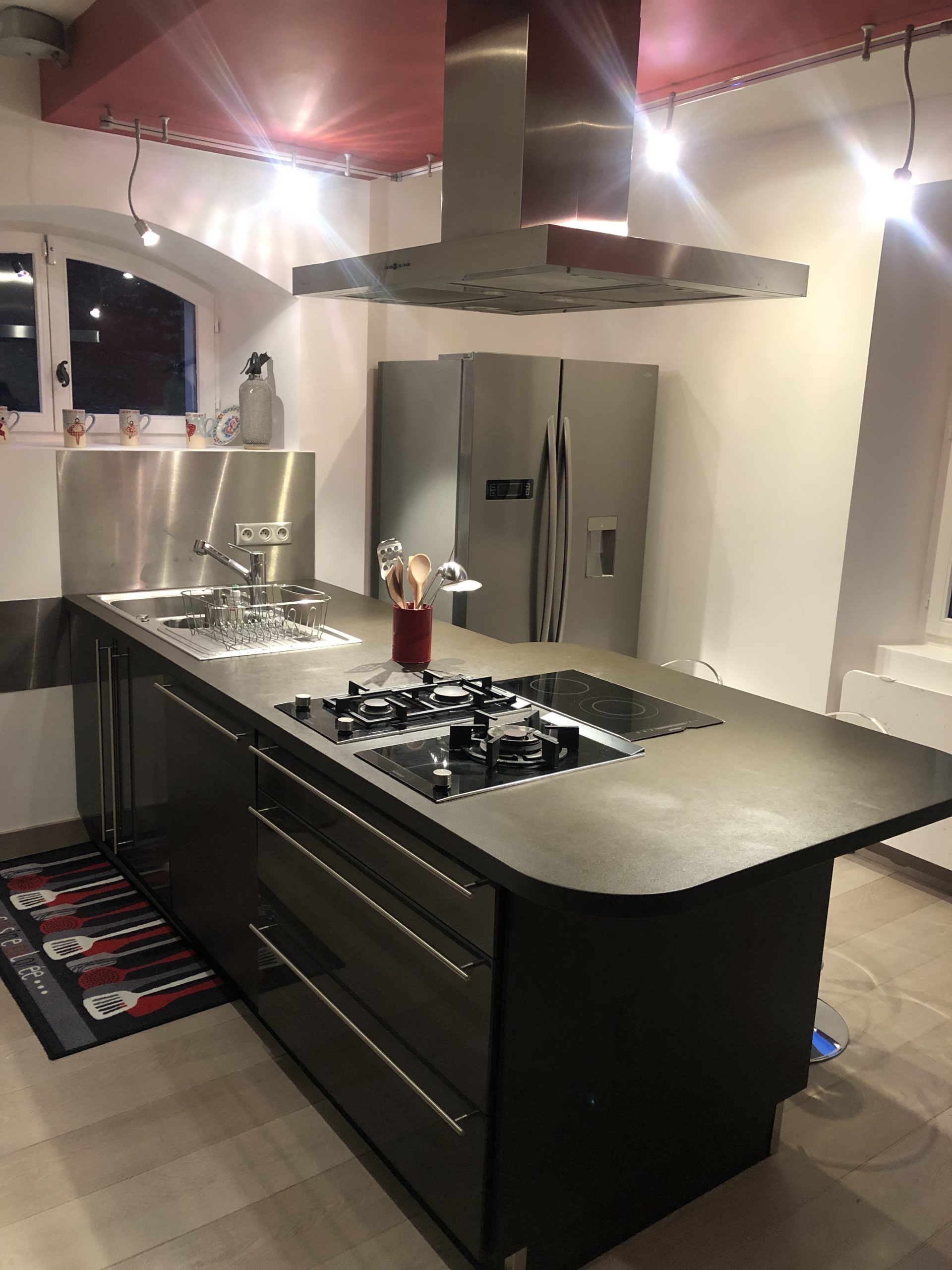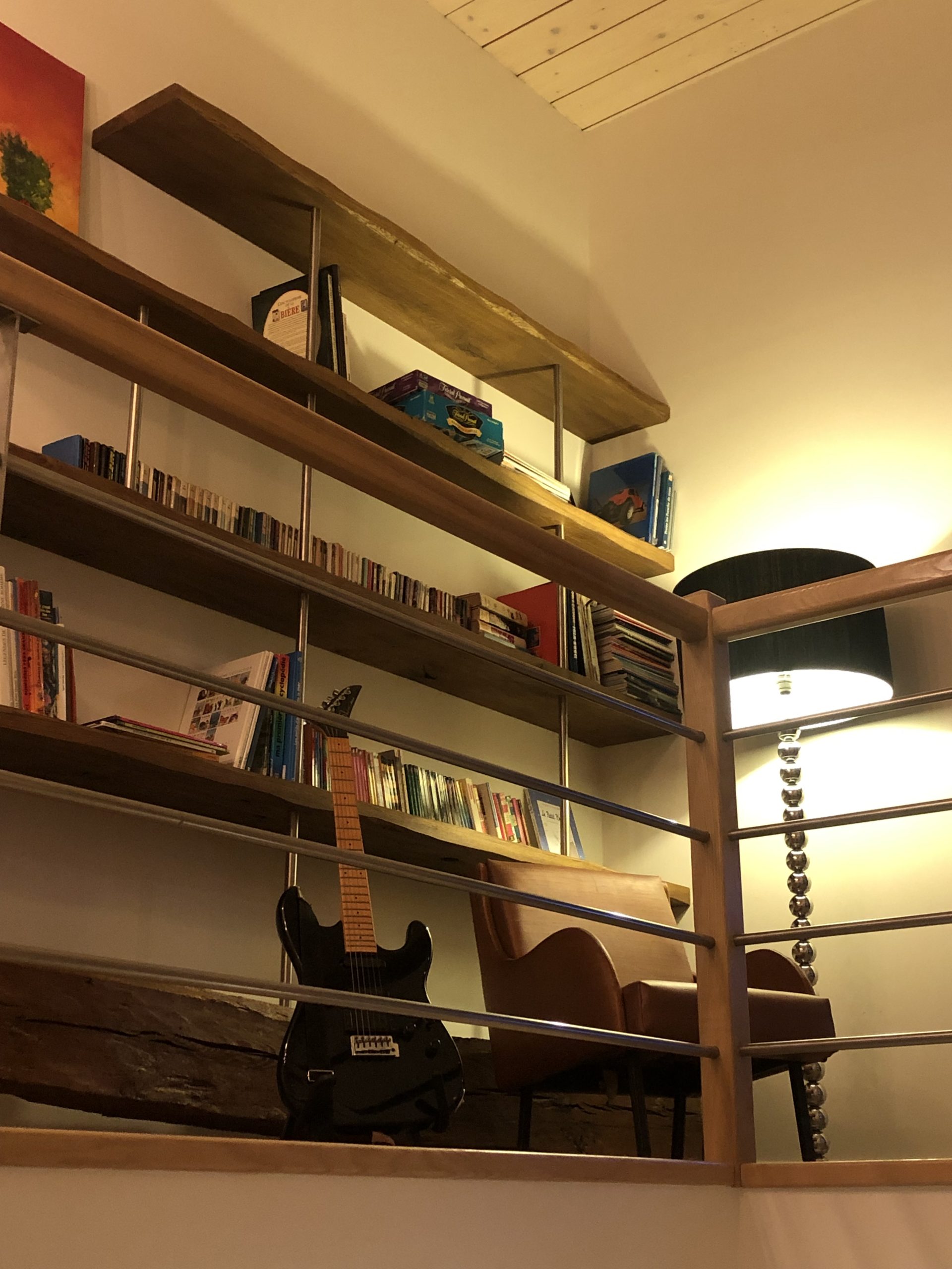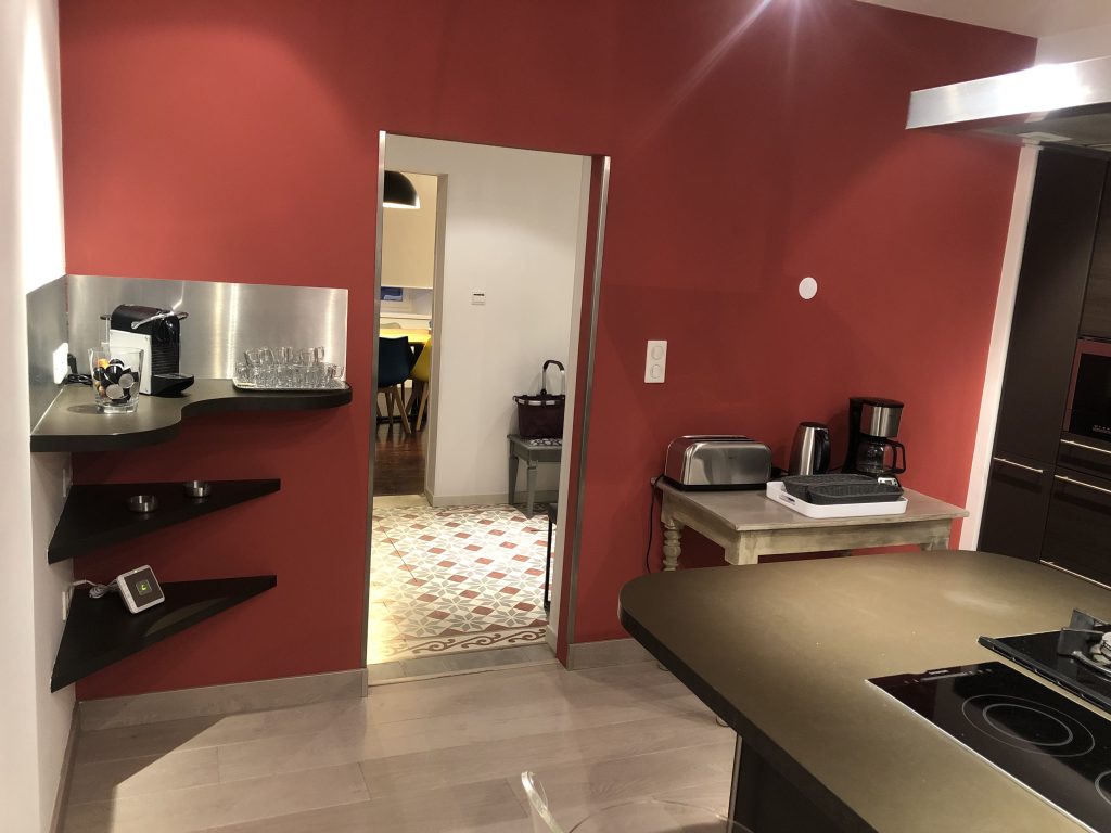 - une vaste suite avec un lit king size et un lit de 100×180, équipée d’une salle de bain avec baignoire et douche, dressing, et d’un espace détente ainsi que d’un espace sport (tapis de marche, vélo).